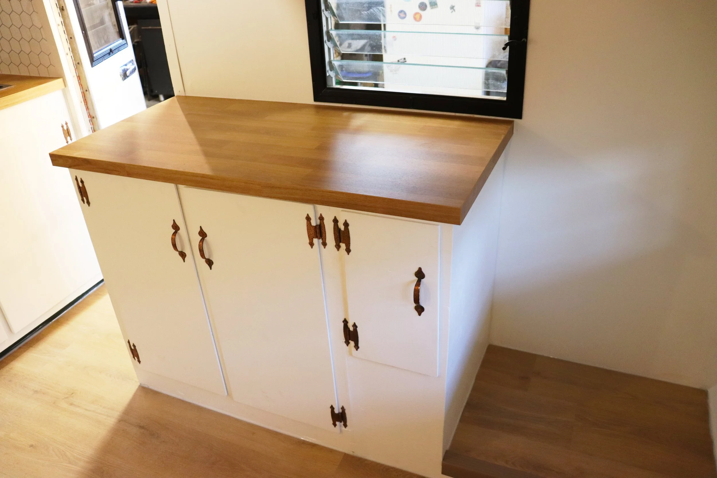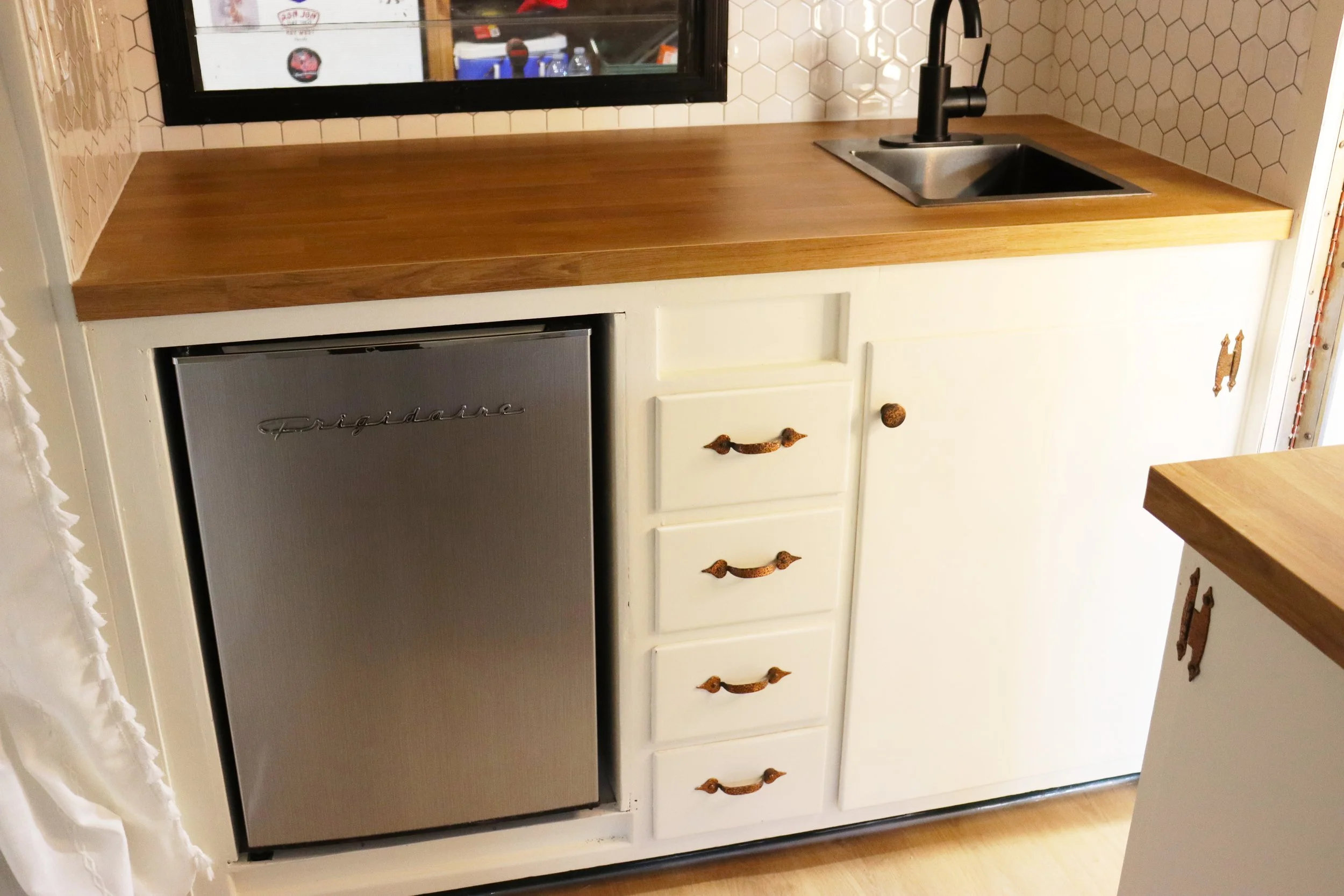 We spent an entire Winter renovating this 1961 beauty. And while there were some hiccups along the way, we love the way it turned out! We decided to keep some original features, like the upper and lower cupboards, copper handles and hinges, scalloped trim, and the classic Forester logo, but we wanted to give it a modern twist.